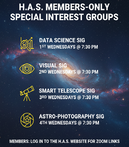 The HAS will not sell or intentionally distribute this information. HAS membership includes membership in the Astronomical League. So that members will receive the league's quarterly magazine, the Reflector, the HAS pays the Astronomical League a portion of each member’s dues, and provides the HAS membership mailing address list to the Astronomical League.